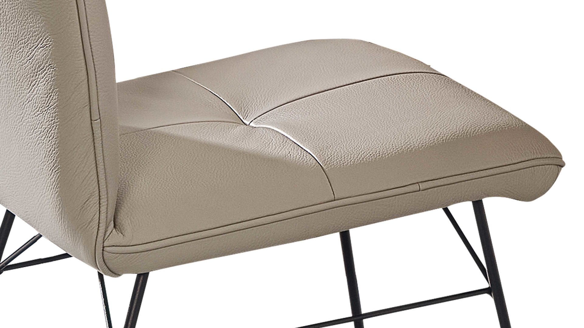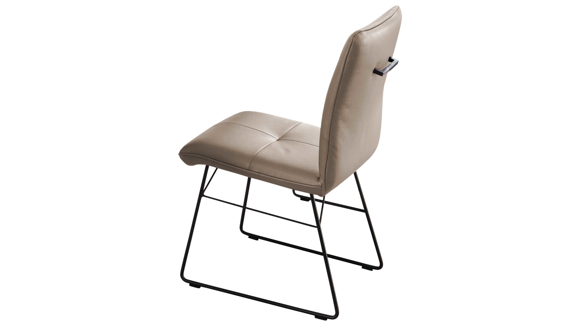Sitzfläche mit Quadratsteppung, glatt bezogene Rückenlehne mit Metallgriff auf der Rückseite