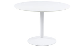 Dieser Esstisch zieht in Ihrer modernen Küche alle Blicke auf sich. Der runde Tisch mit auffälligem Fuß begeistert in strahlendem Weiß und fügt sich damit hervorragend in Ihre Einrichtung ein. Stellen Sie den Esszimmertisch im Retrolook in Ihren Essbereich und freuen Sie sich über die hohe Funktionalität des Esszimmermöbels. Gefertigt aus einer weiß lackierten MDF-Platte und einem Trompetenfuß aus weiß lackiertem Metall begeistert das Esszimmermöbel an geselligen Abenden mit Freunden oder der Familie.