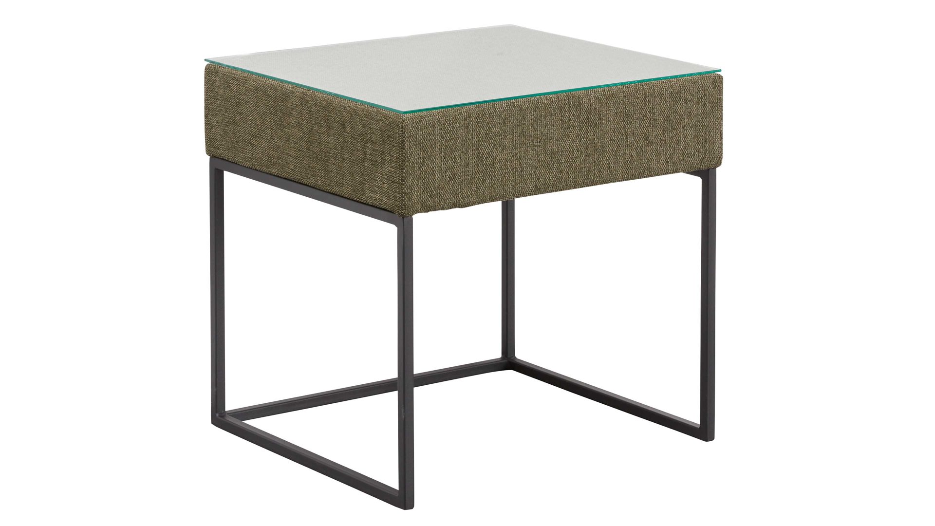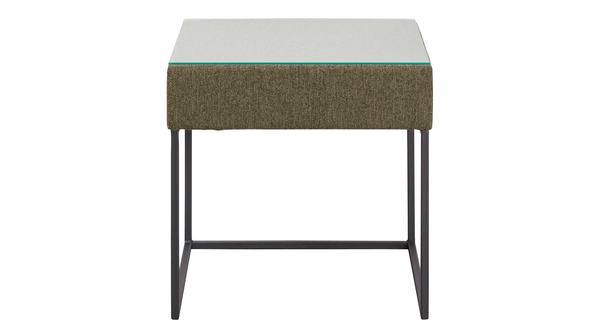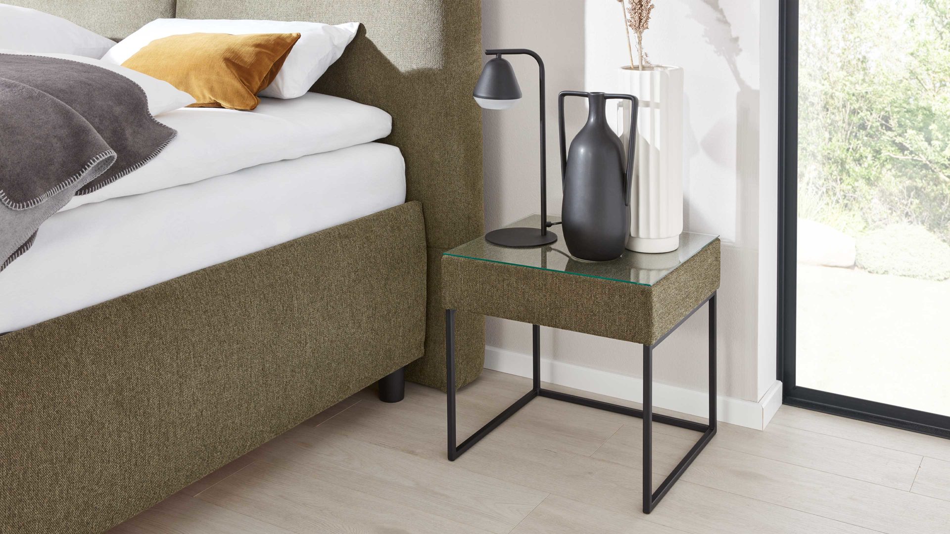 Die Nachtkonsole aus der Interliving Bettsystem Serie 1414 überzeugt mit einer modernen Materialkombination und klarer Formensprache. Der olivgrüne Stoffbezug bringt warme Eleganz in Ihr Schlafzimmer, während die mattschwarzen Metallkufen einen spannenden Kontrast setzen und dem Möbelstück eine schwebende, zeitgemäße Optik verleihen.
