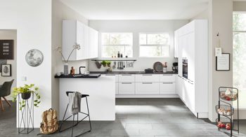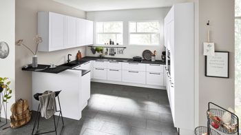 Die Interliving Küche Serie 3045 verbindet klassische Schlichtheit mit modernen Details. Ihre softmatten weißen Fronten wirken zeitlos elegant und harmonieren perfekt mit den premiumweißen Korpussen und Sockelblenden. Für spannende Kontraste sorgen die Arbeitsplatten im Farbton Terra Mare sowie die schwarzen Griffe und der schwarze Tresen, die dem Design eine stilvolle Landhausnote verleihen.
