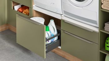 Die Interliving Küche Serie 3074 zeigt, dass auch ein Hauswirtschaftsraum mehr sein kann als nur Stauraum. Mit ihren softmatten olivgrünen Fronten strahlt sie Wärme und Natürlichkeit aus, während die authentische Vulkaneiche-Nachbildung an Sockelblenden, Regalen und Nischenverkleidung für wohnlichen Charakter sorgt. Dezente Metallgriffe runden das harmonische Gesamtbild im beliebten Natural-Living-Stil stilvoll ab.